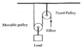 MOVABLE PULLEY: The rope follows a double path around the pulleys. We need half the force to lift the same weight as with a fixed pulley.